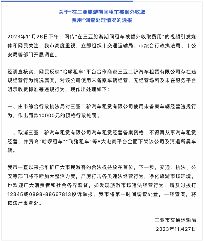 官方通报“游客在三亚租车被额外收取费用”:属实,取消涉事租车公司经营备案资格。