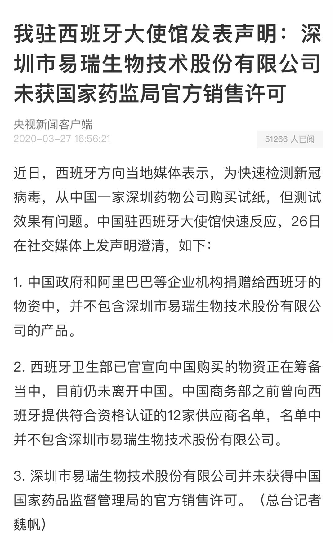 我驻西班牙大使馆发表声明:深圳市易瑞生物技术股份有限公司未获国家药监局官方销售许可。
