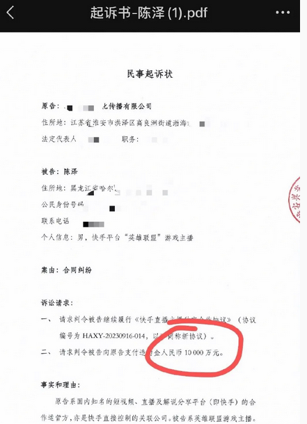 游戏主播遭索赔一个亿,陈泽跳槽抖音直播首秀累计点赞达3.64亿。