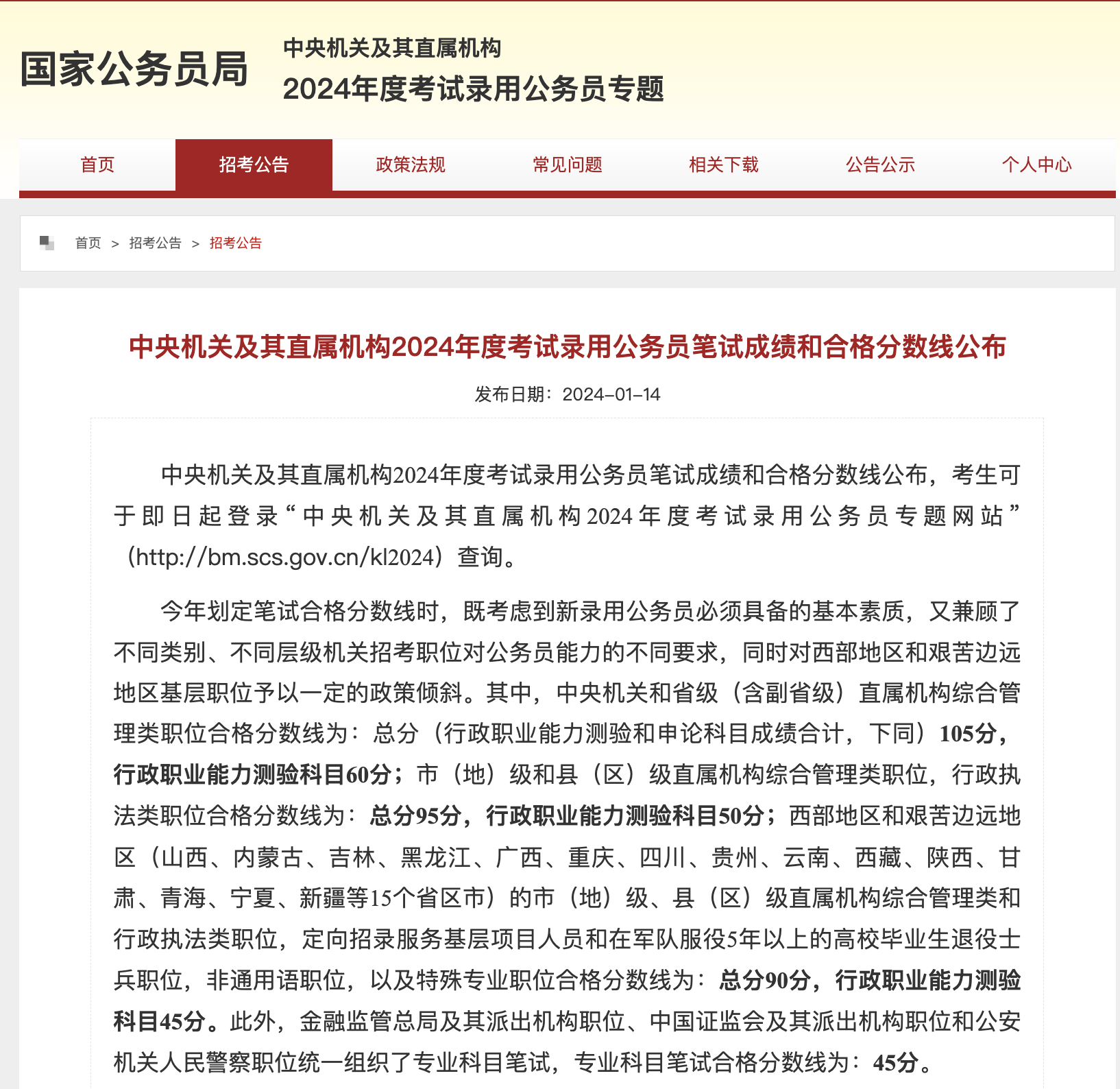 1月14日,中央机关及其直属机构2024年度考试录用公务员笔试成绩和合格分数线公布,其中,中央机关和省级(含副省级)直属机构综合管理类职位合格分数线为:总分(行政职业能力测验和申论科目成绩合计,下同)105分,行政职业能力测验科目60分;市(地)级和县(区)级直属机构综合管理类职位,行政执法类职位合格分数线为:总分95分,行政职业能力测验科目50分。