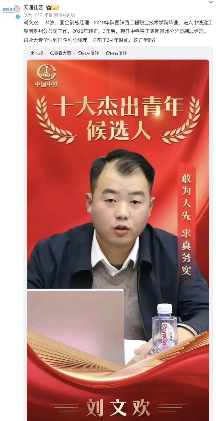 据时间视频,近日,中铁建工集团贵州分公司副总经理刘某某,因只有24岁引发网友热议。据陕西铁路工程职业技术学院公众号,刘某某是该校2020届毕业生,2023年11月,刘某某以中铁建工贵州分公司副总经理身份祝福母校建校50周年。中铁建工集团贵州分公司公众号也曾发文报道,副总经理刘某某参加公司年度总结会。有网友表示,一个职院毕业生,只用3年就当上国企副总,是否有些不正常?