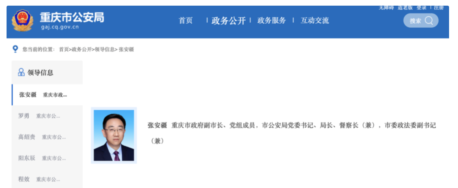 据政知见,重庆市公安局网站“领导信息”一栏最新信息显示,张安疆现任重庆市政府副市长、党组成员,市公安局党委书记、局长、督察长(兼),市委政法委副书记(兼)。