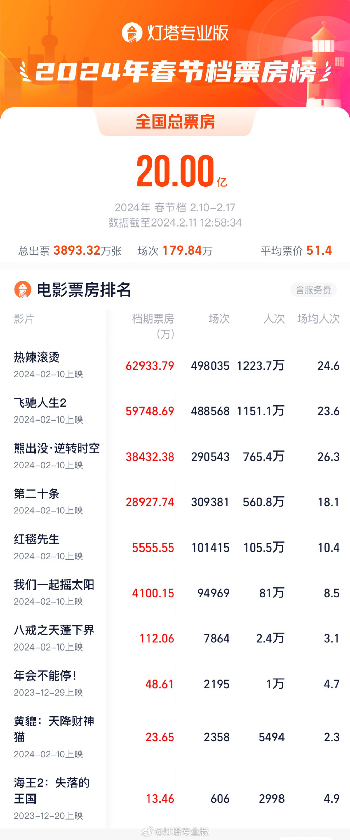 2024春节档票房破20亿。据灯塔专业版数据,截至2月11日12时58分,2024年春节档(2月10日—2月17日)档期总票房(含预售)突破20亿。《热辣滚烫》《飞驰人生2》《熊出没·逆转时空》暂列档期票房前三位。