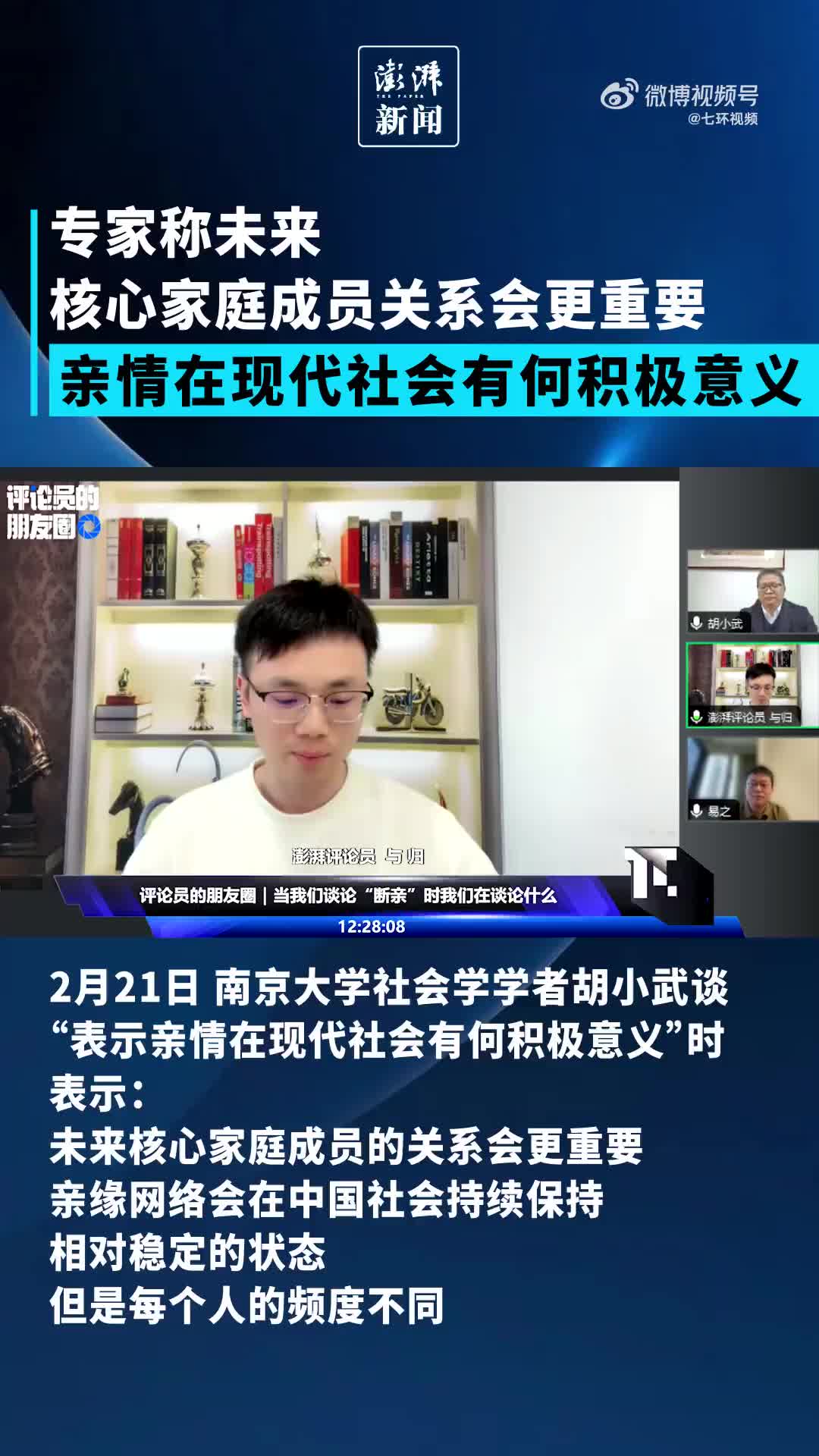 2月21日,南京大学社会学学者胡小武谈“亲情在现代社会有何积极意义”:未来核心家庭成员的关系会更重要,亲缘网络会在中国社会持续保持相对稳定的状态。(via 七环视频)