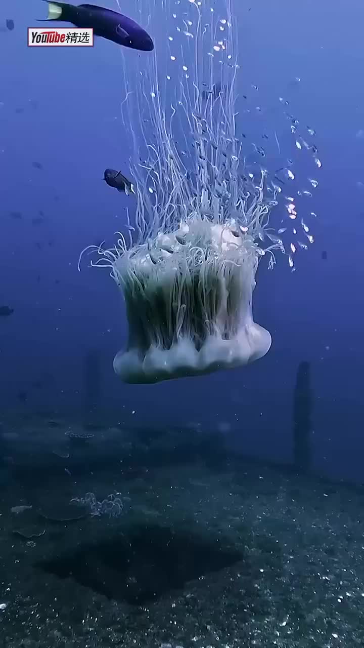 “狮鬃水母”是世界上体型最大的动物之一,完全成年后最多能拥有150多条触手、长达35米。庞大复杂的身躯,也会吸引众多对它毒素免疫的小鱼当做庇护所。作为对比,目前记录中最大的蓝鲸也只有29.9米。(via YTb精选)