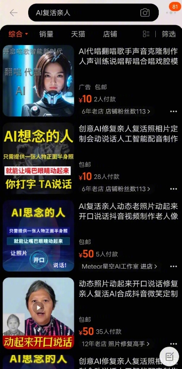 生成式AI技术浪潮之下,目前电商平台上也有越来越多在做AI“复活”生意的商家。当越来越多人知道、接触用AI“复活”逝者,这项面向普通群众且有较高门槛的“技术”,也逐渐变成了一门能赚钱的生意。一些带有AI“复活”标签的商品,标价从几元、几十元,到上百元,乃至数千元不等。在某店铺详情页,对产品介绍道,“本宝贝为定制,需根据具体要求制作视频,不同要求价格不一样。”从销量来看,商品页面显示,有的商家已售超100单,有的已经卖了超400单。可见,AI“复活”逝者的确是有市场的,而且有人已经从中赚到了钱。