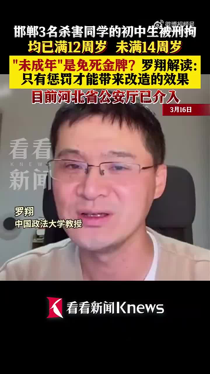 河北邯郸3名涉嫌杀害同学的初中生已被刑拘。据了解,3名犯罪嫌疑人均已满十二周岁、未满十四周岁,这让刑事责任年龄再次成为焦点。3月16日,中国政法大学教授罗翔称,对于已满12周岁不满14周岁人,一些特定的犯罪经最高人民检察院核准追诉,应当负刑事责任。法律从来不可能解决所有的社会问题,对孩子而言,最重要的依然是培养对人对己的尊重。但法律所能做到的,就是对于犯下弥天重罪的人依然要进行必要的惩罚,只有惩罚才能带来改造的效果。 (via 看看新闻KNEWS)
