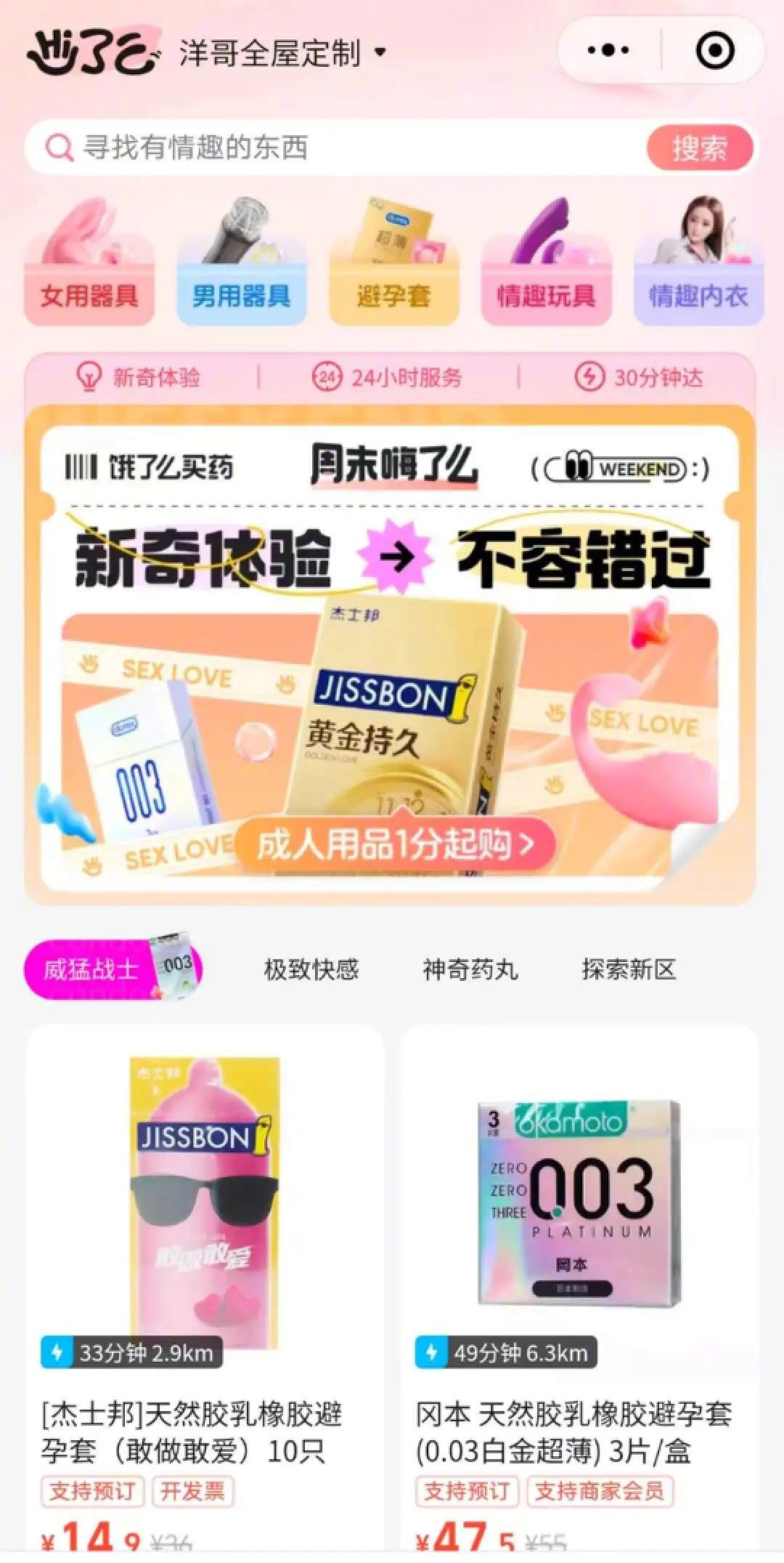据新浪科技,互联网大厂们瞄上了千亿规模的成人情趣用品市场。饿了么在近期推出一个名为“Hi了么”的新业务,定位是成人情趣用品配送平台,由饿了么医药业务所属团队打造,目前已在微信端上线了同名的小程序。