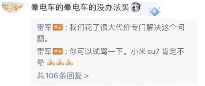 雷军回应网友晕电车:小米SU7肯定不晕车,可以试下。