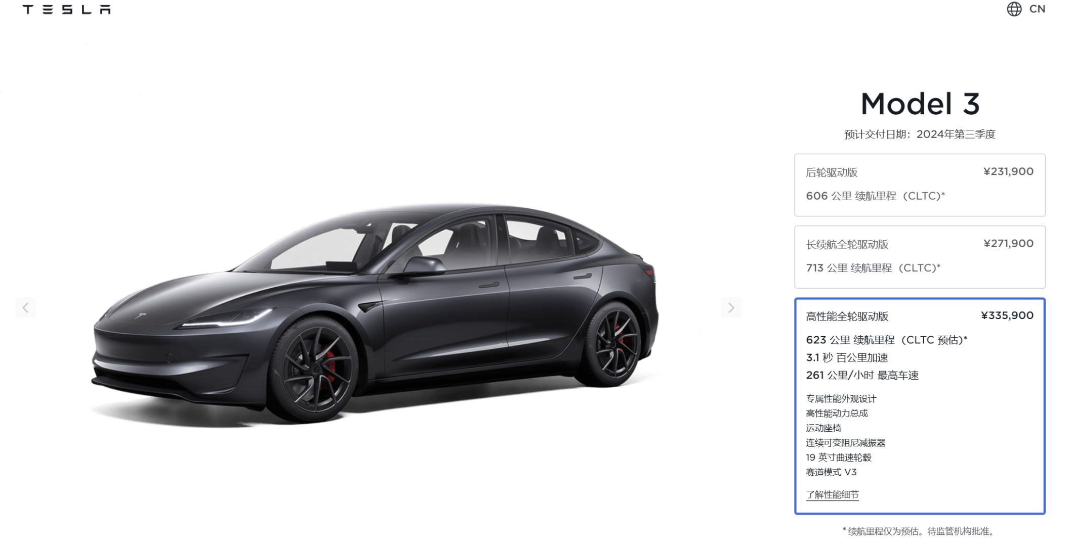 特斯拉中国官网显示,新Model 3高性能版中国定价为33.59万元,预计今年三季度开始交付。 特斯拉发布的新款Model 3 Performance,是一款升级换代的全电动性能车,针对前代车型进行了多项重要改进,该车型在美国的起售价为5.299万美元。