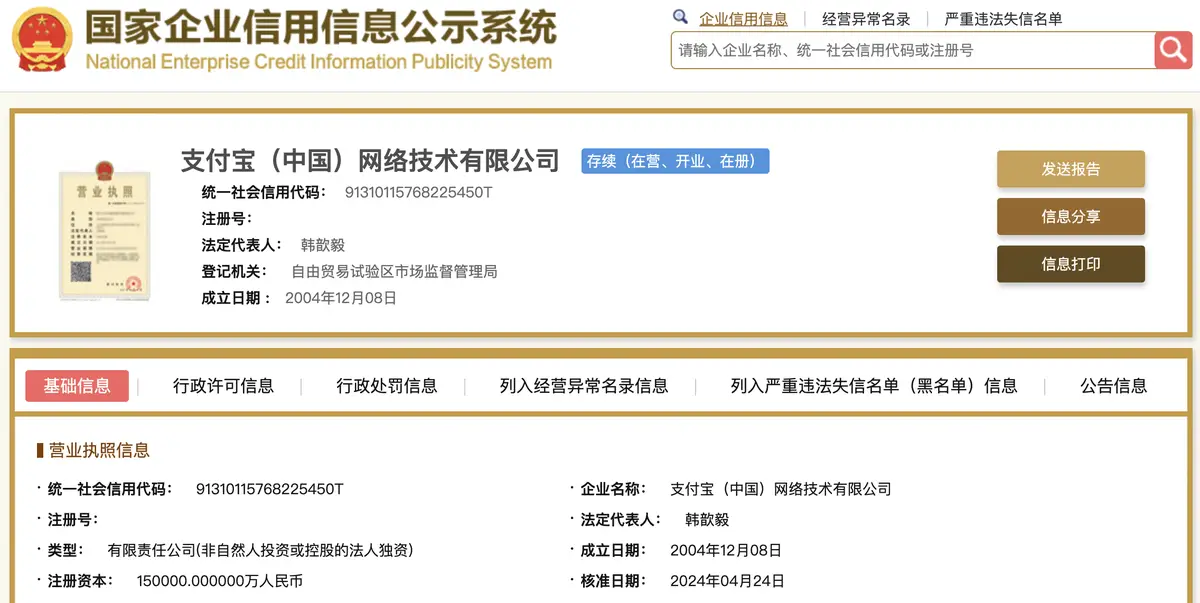 蚂蚁集团组织升级一个月,支付宝法人变更为韩歆毅。