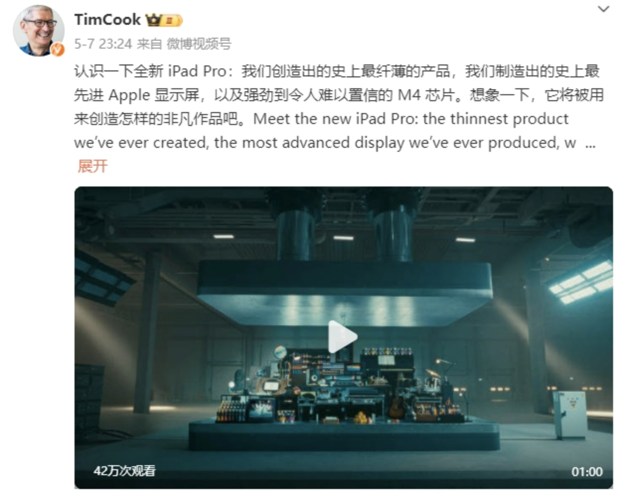 苹果罕见公开道歉!iPad Pro广告引众怒,知名演员评价“毁坏人类体验”。