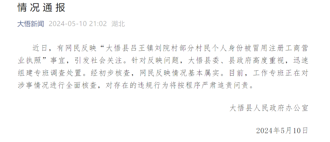 5月10日,湖北大悟县人民政府办公室通报:近日,有网民反映“大悟县吕王镇刘院村部分村民个人身份被冒用注册工商营业执照”事宜,引发社会关注。针对反映问题,大悟县委、县政府高度重视,迅速组建专班调查处置。经初步核查,网民反映情况基本属实。目前,工作专班正在对涉事情况进行全面核查,对存在的违规行为将按程序严肃追责问责。