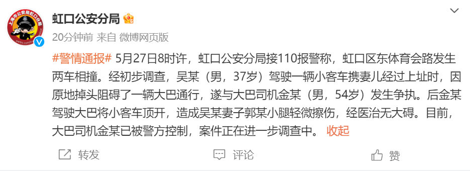 5月27日8时许,虹口公安分局接110报警称,虹口区东体育会路发生两车相撞。经初步调查,吴某(男,37岁)驾驶一辆小客车携妻儿经过上址时,因原地掉头阻碍了一辆大巴通行,遂与大巴司机金某(男,54岁)发生争执。后金某驾驶大巴将小客车顶开,造成吴某妻子郭某小腿轻微擦伤,经医治无大碍。目前,大巴司机金某已被警方控制,案件正在进一步调查中。