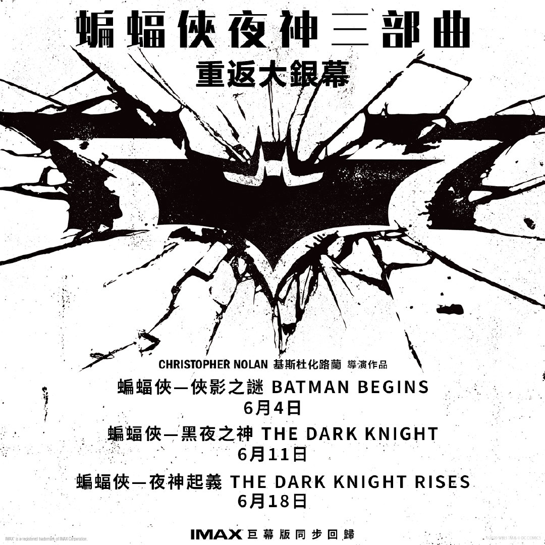 《蝙蝠侠:侠影之谜》《蝙蝠侠:黑暗骑士》《蝙蝠侠:黑暗骑士崛起》三部曲之前确定5月29日开始在台湾重映!现在香港也确定将于6月每周四公映!届时IMAX同步。