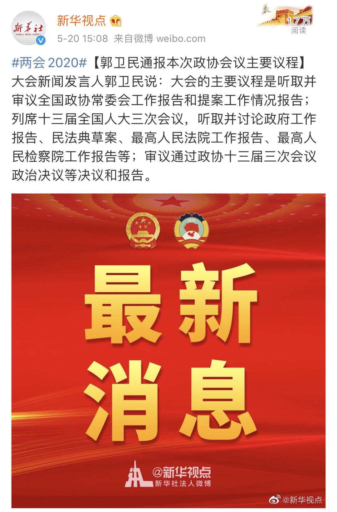 大会新闻发言人郭卫民说:大会的主要议程是听取并审议全国政协常委会工作报告和提案工作情况报告;列席十三届全国人大三次会议,听取并讨论政府工作报告、民法典草案、最高人民法院工作报告、最高人民检察院工作报告等;审议通过政协十三届三次会议政治决议等决议和报告。