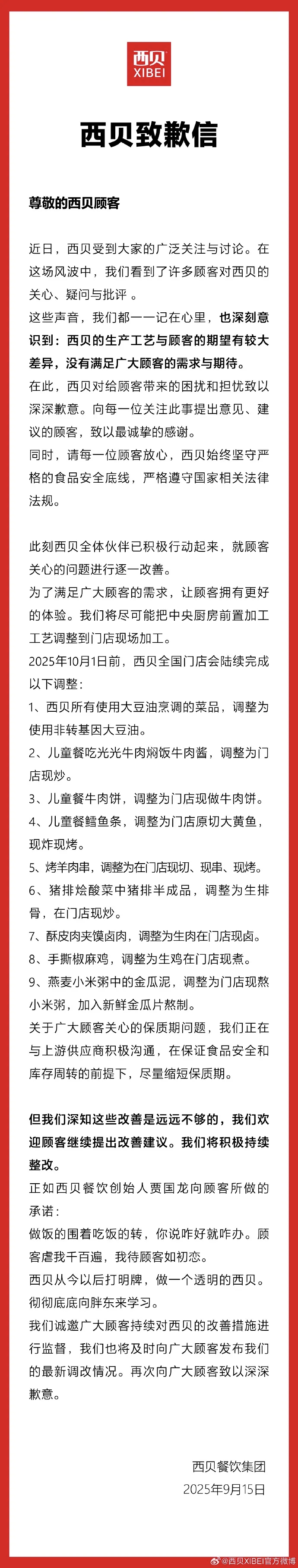 据界面新闻消息,9月15日,西贝发布致歉信称,将尽可能把中央厨房前置加工工艺调整到门店现场加工。2025年10月1日前,西贝全国门店会陆续完成相关调整。